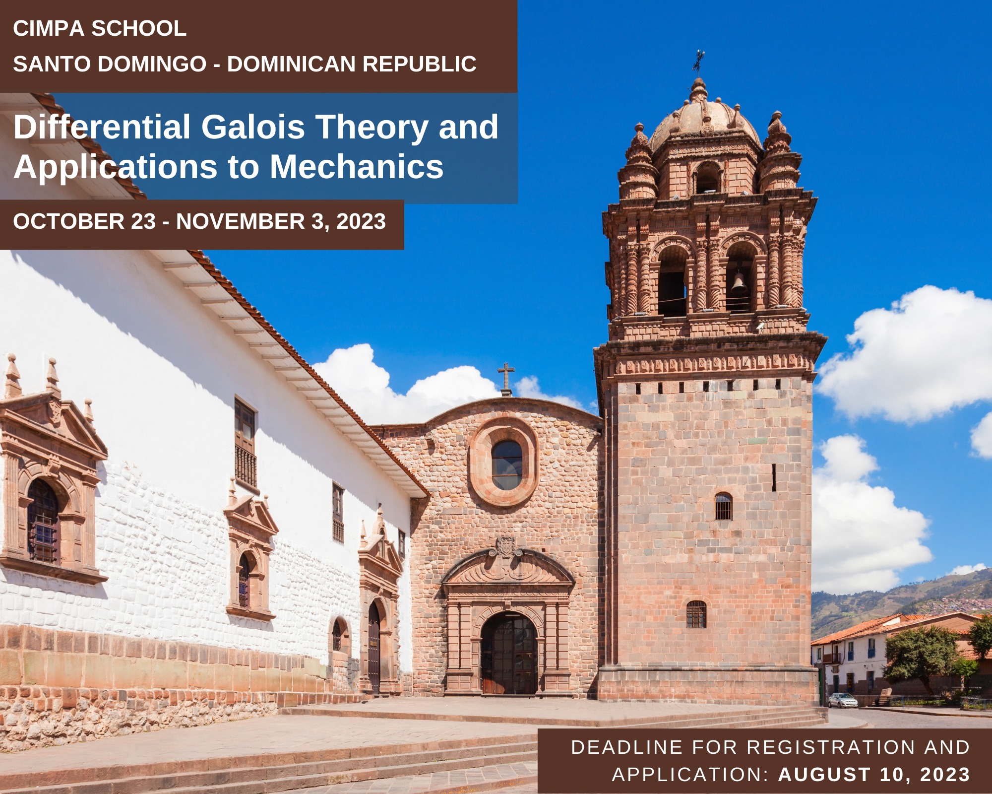 La Escuela CIMPA de Teoría Diferencial de Galois y Aplicaciones a la Mecánica es la primera Escuela CIMPA en República Dominicana. La cual se celebrara del 23 de octubre al 3 de noviembre del 2023 en la Escuela de Matematica, Facultad de Ciencias de la Universidad Autónoma de Santo Domingo.